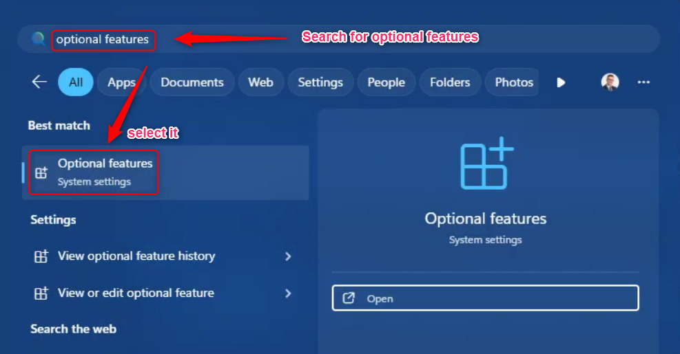 On your START - Search area and type “optional features” and then click “Optional features”