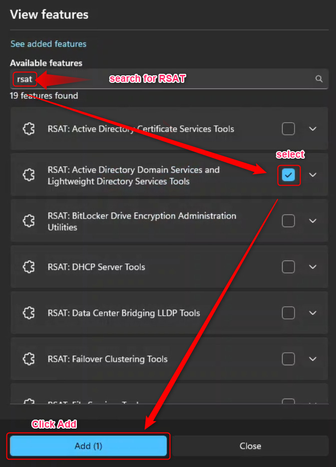 Once that is done, you will then need to search for RSAT, select it and install it.