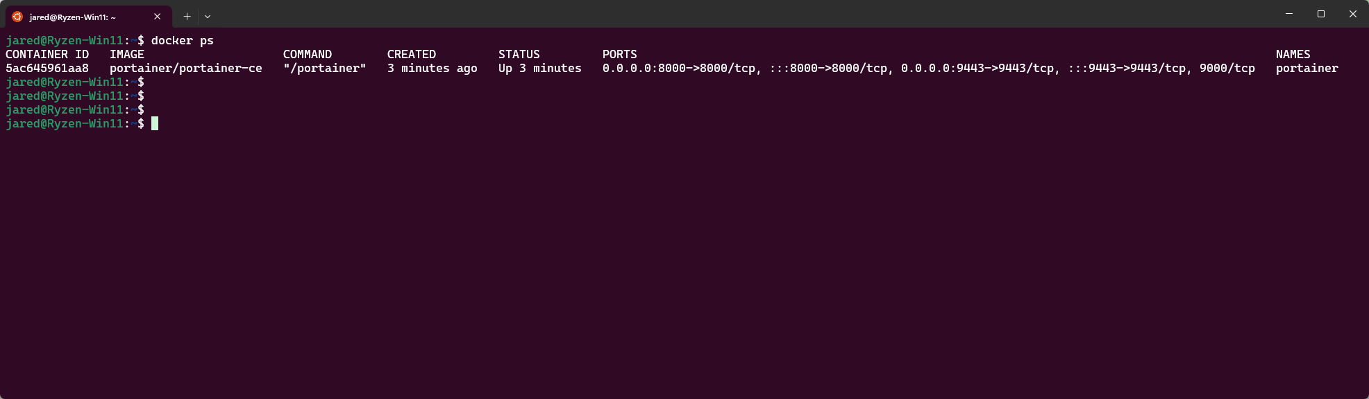 docker run -d -p 8000:8000 -p 9443:9443 --name portainer --restart=always -v /var/run/docker.sock:/var/run/docker.sock -v portainer_data:/data portainer/portainer-ceAfter downloading and installing the Portainer container app you can check and see that it is now running. You can do this by typing this command: