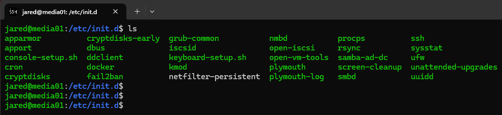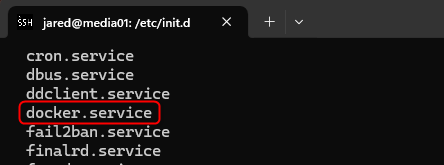 If we go to “/etc/init.d/” and type “ls”, we can also see that the service for docker is “docker”.