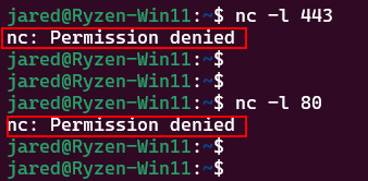 When you see “Permission Denied” it means there is already another service running on that port. This is another great way to test if a port is running on the machine. Imagine installing an application and wondering why it isn’t communicating just to find out that the port is already being listened on by another app you may or may not be aware of.