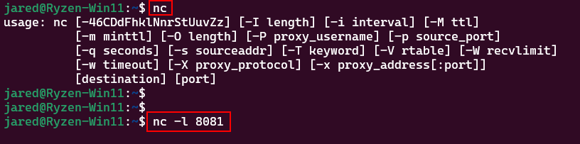 I always forget that the Netcat command (nc) can be used as a listener. This is due to the listener option missing in the help output. Here is what the help info says. I have also told the machine to start listening on port 8081 using the command below: