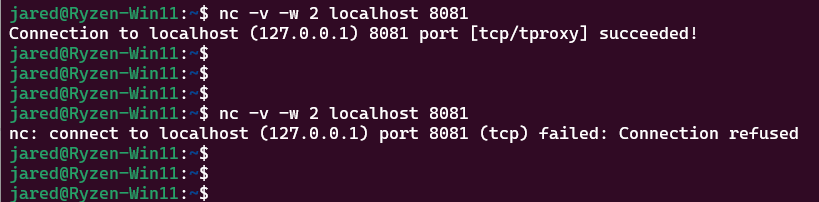 nc -v -w 2 localhost 8081In the screenshot below you can see it worked the first time. If I run the command right after the first one you can see it fails on the second try. As stated, this is to be expected unless you restart the listener.